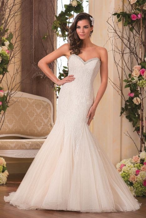 A timeless A-line gown with strapless sweetheart bodice with embroidered lace, and a full tulle floor-length skirt.